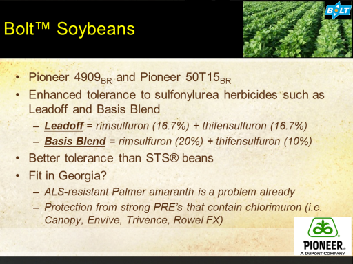 Bolt™ Soybeans<BR>Pioneer 4909BR and Pioneer 50T15BR  <BR>Enhanced tolerance to sulfonylurea herbicides such as Leadoff and Basis Blend <BR>Leadoff = rimsulfuron (16.7%) + thifensulfuron (16.7%) <BR>Basis Blend = rimsulfuron (20%) + thifensulfuron (10%) <BR>Better tolerance than STS® beans <BR>Fit in Georgia? <BR>ALS-resistant Palmer amaranth is a problem already <BR>Protection from strong PRE’s that contain chlorimuron (i.e. Canopy, Envive, Trivence, Rowel FX)<BR>