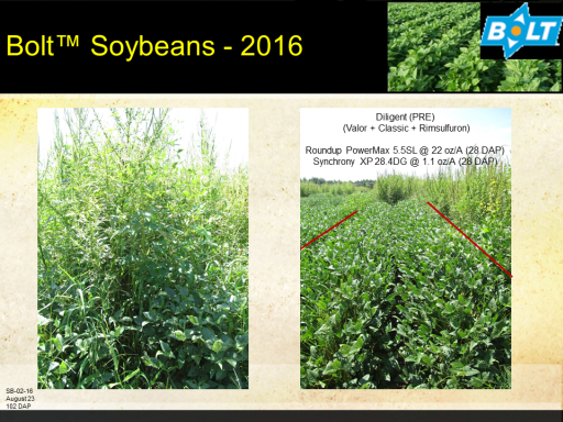 Bolt™ Soybeans - 2016<BR>SB-02-16 <BR>August 23 <BR>102 DAP<BR>Diligent (PRE) <BR> (Valor + Classic + Rimsulfuron) <BR> <BR>Roundup PowerMax 5.5SL @ 22 oz/A (28 DAP) <BR>Synchrony XP 28.4DG @ 1.1 oz/A (28 DAP)<BR>