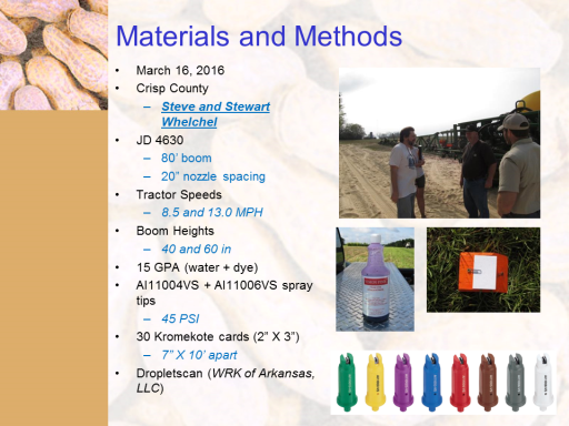 Materials and Methods<BR>March 16, 2016 <BR>Crisp County <BR>Steve and Stewart Whelchel <BR>JD 4630 <BR>80’ boom <BR>20” nozzle spacing <BR>Tractor Speeds <BR>8.5 and 13.0 MPH <BR>Boom Heights <BR>40 and 60 in <BR>15 GPA (water + dye) <BR>AI11004VS + AI11006VS spray tips <BR>45 PSI <BR>30 Kromekote cards (2” X 3”) <BR>7” X 10’ apart <BR>Dropletscan (WRK of Arkansas, LLC)<BR>