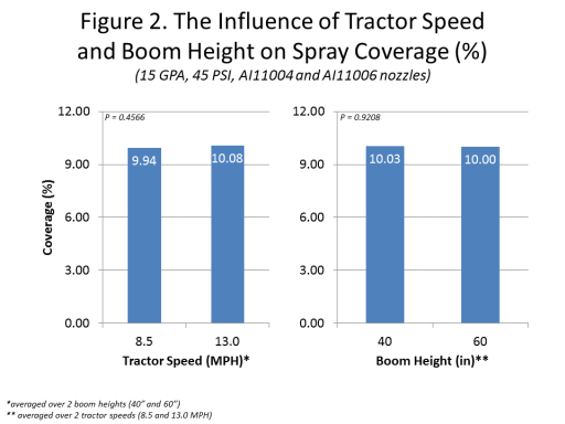 Figure 2. The Influence of Tractor Speed  and Boom Height on Spray Coverage (%) (15 GPA, 45 PSI, AI11004 and AI11006 nozzles)<BR>P = 0.4566<BR>P = 0.9208<BR>*averaged over 2 boom heights (40” and 60”) <BR>** averaged over 2 tractor speeds (8.5 and 13.0 MPH)<BR>