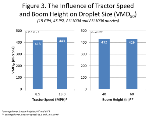 Figure 3. The Influence of Tractor Speed  and Boom Height on Droplet Size (VMD50) (15 GPA, 45 PSI, AI11004 and AI11006 nozzles)<BR>LSD 0.10 = 3<BR>P = 0.3107<BR>*averaged over 2 boom heights (40” and 60“) <BR>** averaged over 2 tractor speeds (8.5 and 13.0 MPH)<BR>