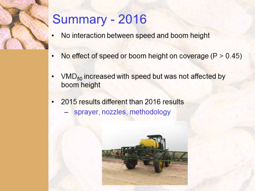 Summary - 2016<BR>No interaction between speed and boom height <BR> <BR>No effect of speed or boom height on coverage (P > 0.45) <BR> <BR>VMD50 increased with speed but was not affected by boom height <BR> <BR>2015 results different than 2016 results <BR> sprayer, nozzles, methodology <BR>