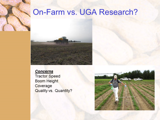 On-Farm vs. UGA Research?<BR>Concerns <BR>Tractor Speed  <BR>Boom Height <BR>Coverage <BR>Quality vs. Quantity?<BR>