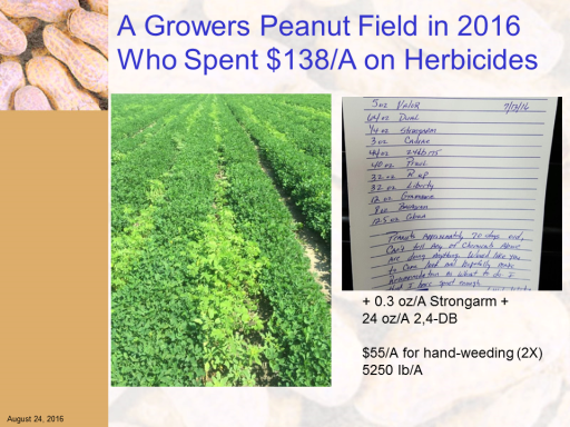 A Growers Peanut Field in 2016 Who Spent $138/A on Herbicides<BR>August 24, 2016<BR>+ 0.3 oz/A Strongarm +  <BR>24 oz/A 2,4-DB <BR> <BR>$55/A for hand-weeding (2X) <BR>5250 lb/A <BR>