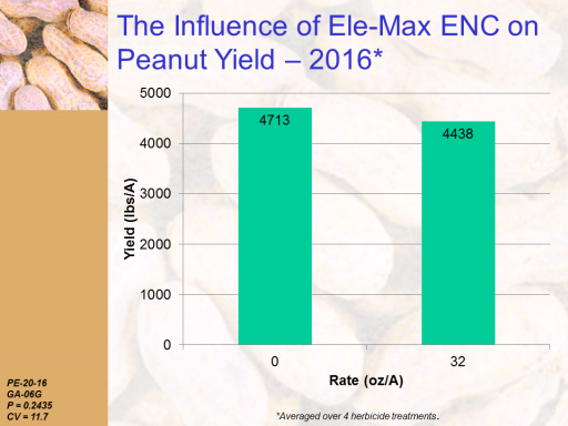 The Influence of Ele-Max ENC on Peanut Yield – 2016*<BR>*Averaged over 4 herbicide treatments.<BR>PE-20-16 <BR>GA-06G <BR>P = 0.2435 <BR>CV = 11.7<BR>
