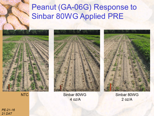 Peanut (GA-06G) Response to Sinbar 80WG Applied PRE<BR>PE-21-16 <BR>21 DAT<BR>NTC<BR>Sinbar 80WG  <BR>4 oz/A<BR>Sinbar 80WG <BR>2 oz/A<BR>