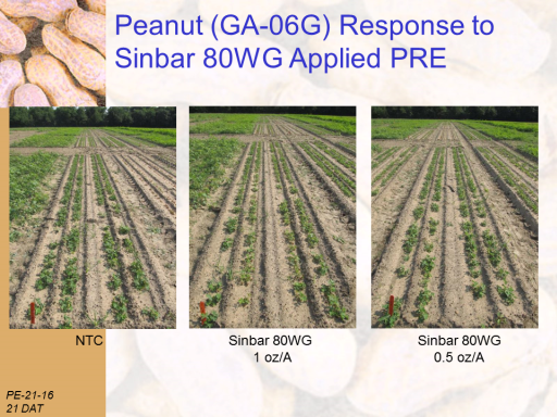 Peanut (GA-06G) Response to Sinbar 80WG Applied PRE<BR>PE-21-16 <BR>21 DAT<BR>NTC<BR>Sinbar 80WG  <BR>1 oz/A<BR>Sinbar 80WG <BR>0.5 oz/A<BR>