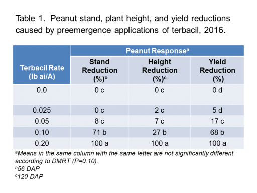 Table 1.  Peanut stand, plant height, and yield reductions caused by preemergence applications of terbacil, 2016.<BR>aMeans in the same column with the same letter are not significantly different  <BR>according to DMRT (P=0.10). <BR>b56 DAP <BR>c120 DAP<BR>