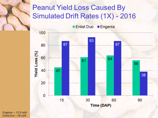Peanut Yield Loss Caused By Simulated Drift Rates (1X) - 2016<BR>Engenia  = 12.8 oz/A <BR>Enlist Duo = 56 oz/A<BR>
