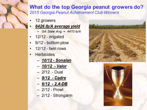 What do the top Georgia peanut growers do? 2015 Georgia Peanut Achievement Club Winners<BR>12 growers <BR>6426 lb/A average yield <BR>GA State Avg. =  4470 lb/A <BR>12/12 - irrigated <BR>9/12 - bottom plow <BR>12/12 - twin rows <BR>Herbicides <BR>10/12 - Sonalan <BR>10/12  - Valor <BR>2/12  - Dual <BR>9/12  - Cadre <BR>6/12  - 2,4-DB <BR>2/12 - Prowl <BR>2/12 - Strongarm  <BR>