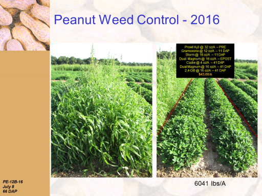 Peanut Weed Control - 2016<BR>PE-12B-16 <BR>July 8 <BR>66 DAP<BR>Prowl H20 @ 32 oz/A – PRE <BR>Gramoxone @ 12 oz/A – 11 DAP <BR>Storm @ 16 oz/A – 11 DAP <BR>Dual  Magnum @ 16 oz/A – EPOST <BR>Cadre @ 4 oz/A – 41 DAP <BR>Dual Magnum @ 16 oz/A – 41 DAP <BR>2,4-DB @ 16 oz/A – 41 DAP <BR>$43.00/A<BR>6041 lbs/A<BR>