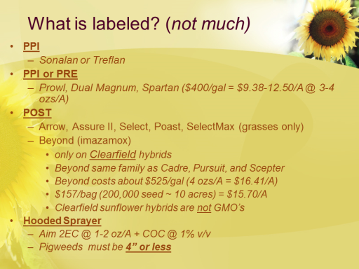 What is labeled? (not much)<BR>PPI <BR>Sonalan or Treflan <BR>PPI or PRE <BR>Prowl, Dual Magnum, Spartan ($400/gal = $9.38-12.50/A @ 3-4 ozs/A) <BR>POST <BR>Arrow, Assure II, Select, Poast, SelectMax (grasses only) <BR>Beyond (imazamox) <BR>only on Clearfield hybrids <BR>Beyond same family as Cadre, Pursuit, and Scepter <BR>Beyond costs about $525/gal (4 ozs/A = $16.41/A) <BR>$157/bag (200,000 seed ~ 10 acres) = $15.70/A <BR>Clearfield sunflower hybrids are not GMO’s <BR>Hooded Sprayer  <BR>Aim 2EC @ 1-2 oz/A + COC @ 1% v/v <BR>Pigweeds  must be 4” or less  <BR>