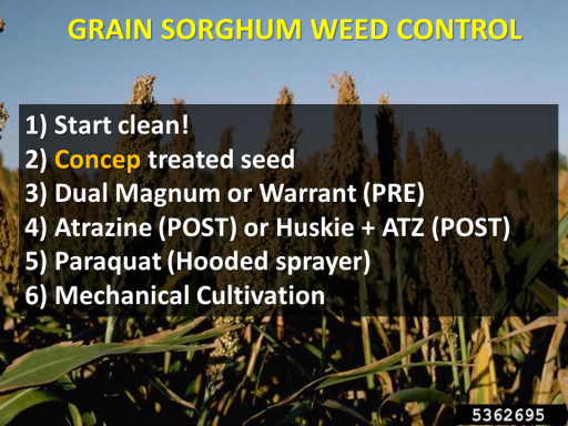 GRAIN SORGHUM WEED CONTROL<BR> Start clean! <BR> Concep treated seed <BR> Dual Magnum or Warrant (PRE) <BR> Atrazine (POST) or Huskie + ATZ (POST) <BR> Paraquat (Hooded sprayer) <BR> Mechanical Cultivation<BR>