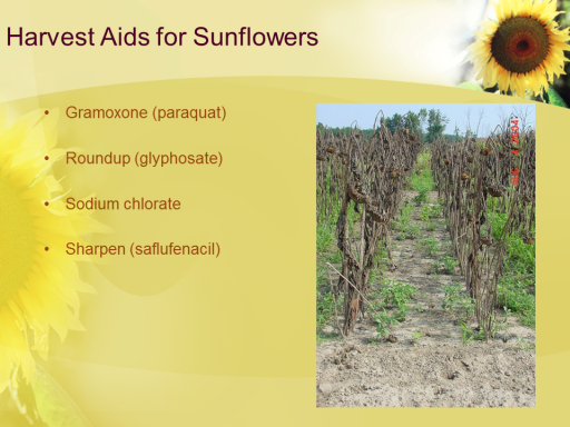 Harvest Aids for Sunflowers<BR>Gramoxone (paraquat) <BR> <BR>Roundup (glyphosate) <BR> <BR>Sodium chlorate <BR> <BR>Sharpen (saflufenacil)<BR>
