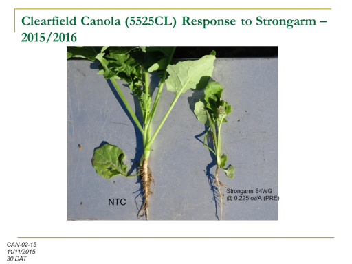 Clearfield Canola (5525CL) Response to Strongarm – 2015/2016<BR>CAN-02-15 <BR>11/11/2015 <BR>30 DAT<BR>Strongarm 84WG  <BR>@ 0.225 oz/A (PRE)<BR>