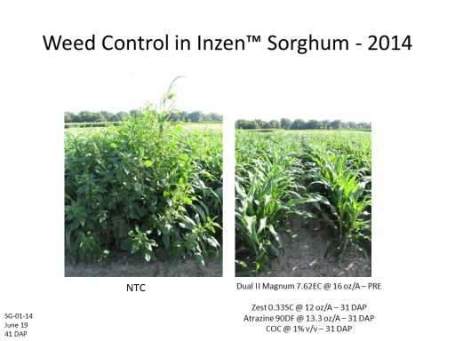 Weed Control in Inzen™ Sorghum - 2014<BR>SG-01-14 <BR>June 19 <BR>41 DAP<BR>NTC<BR>Dual II Magnum 7.62EC @ 16 oz/A – PRE <BR> <BR>Zest 0.33SC @ 12 oz/A – 31 DAP <BR>Atrazine 90DF @ 13.3 oz/A – 31 DAP <BR>COC @ 1% v/v – 31 DAP<BR>