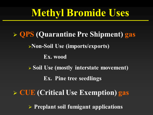 Methyl Bromide Uses <BR> <BR> <BR> QPS (Quarantine Pre Shipment) gas <BR>Non-Soil Use (imports/exports) <BR>	Ex. wood <BR> Soil Use (mostly interstate movement) <BR>	Ex.  Pine tree seedlings <BR> CUE (Critical Use Exemption) gas <BR> Preplant soil fumigant applications<BR>