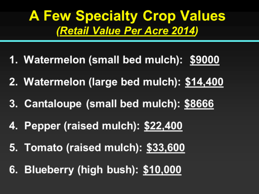 A Few Specialty Crop Values (Retail Value Per Acre 2014)<BR>Watermelon (small bed mulch):  $9000 <BR>Watermelon (large bed mulch): $14,400 <BR>3.  Cantaloupe (small bed mulch): $8666 <BR>4.  Pepper (raised mulch): $22,400 <BR>5.  Tomato (raised mulch): $33,600 <BR>6.  Blueberry (high bush): $10,000<BR>