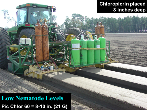 Chloropicrin placed 8 inches deep<BR>Pic Chlor 60 = 8-10 in. (21 G)<BR>Low Nematode Levels<BR>