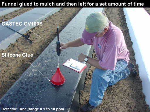 Detector Tube Range 0.1 to 18 ppm<BR>GASTEC GV100S<BR>Silicone Glue<BR>Funnel glued to mulch and then left for a set amount of time<BR>