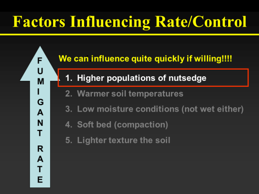 Factors Influencing Rate/Control <BR>FUMIGANT <BR>RATE<BR>1.  <BR>1.  Higher populations of nutsedge <BR>2.  Warmer soil temperatures <BR>3.  Low moisture conditions (not wet either) <BR>4.  Soft bed (compaction) <BR>5.  Lighter texture the soil <BR>We can influence quite quickly if willing!!!!<BR>