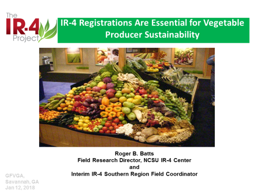 IR-4 Registrations Are Essential for Vegetable Producer Sustainability<BR>Roger B. Batts <BR>Field Research Director, NCSU IR-4 Center  <BR>and <BR>Interim IR-4 Southern Region Field Coordinator<BR>GFVGA, Savannah, GA <BR>Jan 12, 2018<BR>