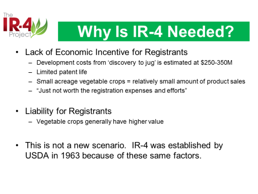 Why Is IR-4 Needed?<BR>Lack of Economic Incentive for Registrants <BR>Development costs from ‘discovery to jug’ is estimated at $250-350M <BR>Limited patent life <BR>Small acreage vegetable crops = relatively small amount of product sales <BR>“Just not worth the registration expenses and efforts” <BR> <BR>Liability for Registrants <BR>Vegetable crops generally have higher value <BR> <BR>This is not a new scenario.  IR-4 was established by USDA in 1963 because of these same factors.  <BR> <BR> <BR> <BR> <BR>