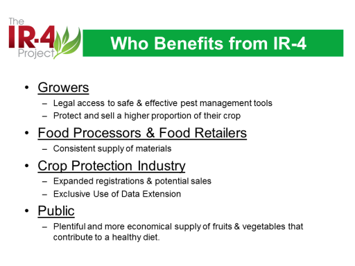 Who Benefits from IR-4 <BR>Growers  <BR>Legal access to safe & effective pest management tools <BR>Protect and sell a higher proportion of their crop <BR>Food Processors & Food Retailers <BR>Consistent supply of materials <BR>Crop Protection Industry <BR>Expanded registrations & potential sales <BR>Exclusive Use of Data Extension  <BR>Public <BR>Plentiful and more economical supply of fruits & vegetables that contribute to a healthy diet. <BR> <BR> <BR> <BR> <BR> <BR>