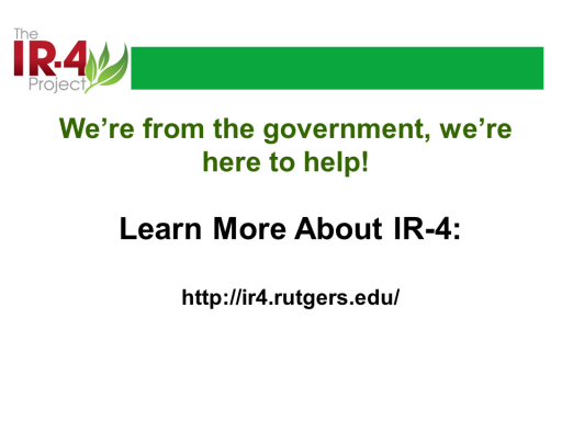 We’re from the government, we’re here to help!<BR>Learn More About IR-4: <BR> <BR>http://ir4.rutgers.edu/<BR>