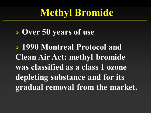 Methyl Bromide <BR> <BR> Over 50 years of use <BR> 1990 Montreal Protocol and Clean Air Act: methyl bromide was classified as a class 1 ozone depleting substance and for its gradual removal from the market.<BR>
