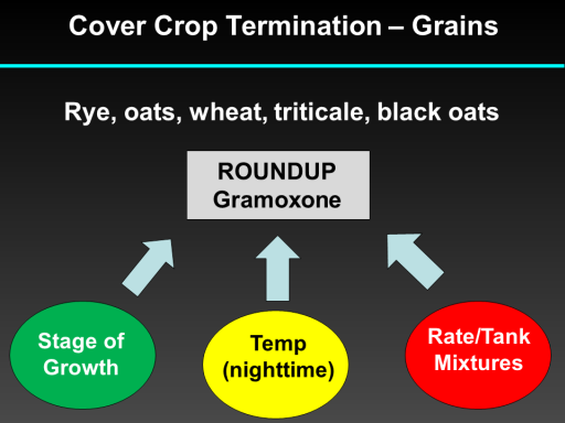 Cover Crop Termination – Grains<BR>Rye, oats, wheat, triticale, black oats<BR>ROUNDUP <BR>Gramoxone<BR>Stage of Growth<BR>Temp <BR>(nighttime)<BR>Rate/Tank Mixtures<BR>