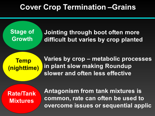 Cover Crop Termination –Grains<BR>Stage of Growth<BR>Temp <BR>(nighttime)<BR>Rate/Tank Mixtures<BR>Jointing through boot often more difficult but varies by crop planted<BR>Varies by crop – metabolic processes in plant slow making Roundup slower and often less effective<BR>Antagonism from tank mixtures is common, rate can often be used to overcome issues or sequential applic<BR>