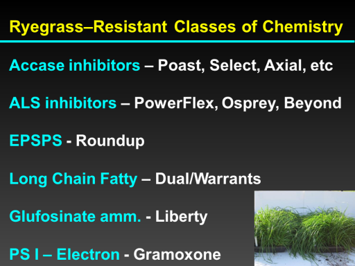 Ryegrass–Resistant Classes of Chemistry <BR>Accase inhibitors – Poast, Select, Axial, etc <BR>ALS inhibitors – PowerFlex, Osprey, Beyond <BR>EPSPS - Roundup <BR>Long Chain Fatty – Dual/Warrants <BR>Glufosinate amm. - Liberty <BR>PS I – Electron - Gramoxone<BR>