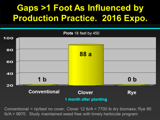 Gaps >1 Foot As Influenced by Production Practice.  2016 Expo.<BR>Conventional = rip/bed no cover; Clover 12 lb/A = 7700 lb dry biomass; Rye 90 lb/A = 9970.  Study maintained weed free with timely herbicide program<BR>1 b<BR>0 b<BR>Conventional<BR>88 a<BR>Rye<BR>Clover<BR>Plots 18 feet by 450 <BR>1 month after planting<BR>