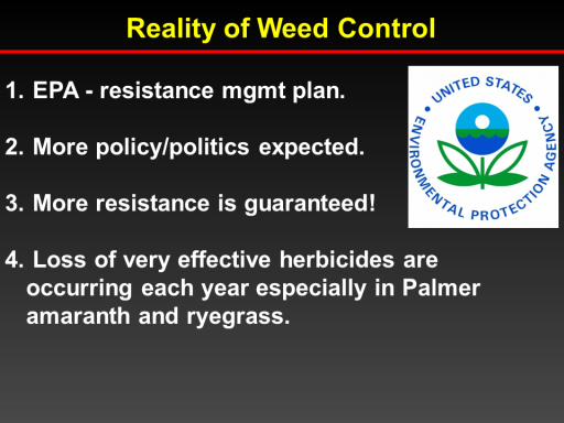 EPA - resistance mgmt plan. <BR> <BR> More policy/politics expected. <BR> <BR> More resistance is guaranteed! <BR> <BR> Loss of very effective herbicides are occurring each year especially in Palmer amaranth and ryegrass.  <BR> <BR>Reality of Weed Control<BR>