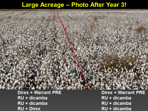 Direx + Warrant PRE <BR>RU + dicamba  <BR>RU + dicamba <BR>RU + Direx<BR>Direx + Warrant PRE <BR>RU + dicamba  <BR>RU + dicamba <BR>RU + dicamba<BR>Large Acreage – Photo After Year 3!<BR>