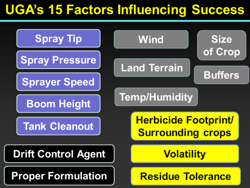 Spray Tip<BR>Wind<BR>Land Terrain<BR>Residue Tolerance<BR>Spray Pressure<BR>Buffers<BR>Boom Height<BR>Tank Cleanout<BR>Proper Formulation<BR>UGA’s 15 Factors Influencing Success<BR>Sprayer Speed<BR>Drift Control Agent<BR>Herbicide Footprint/ Surrounding crops<BR>Volatility<BR>Temp/Humidity<BR>Size  <BR>of Crop<BR>