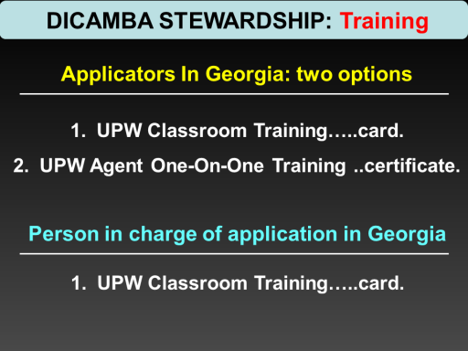 DICAMBA STEWARDSHIP: Training<BR>Applicators In Georgia: two options  <BR> <BR>UPW Classroom Training…..card. <BR>UPW Agent One-On-One Training ..certificate. <BR>Person in charge of application in Georgia <BR> <BR>UPW Classroom Training…..card. <BR>