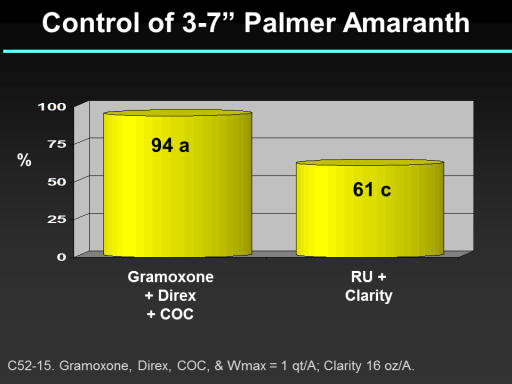 Control of 3-7” Palmer Amaranth  <BR>C52-15. Gramoxone, Direx, COC, & Wmax = 1 qt/A; Clarity 16 oz/A.  <BR>