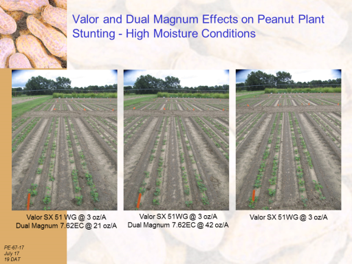Valor and Dual Magnum Effects on Peanut Plant Stunting - High Moisture Conditions <BR>PE-67-17 <BR>July 17 <BR>19 DAT<BR>Valor SX 51 WG @ 3 oz/A <BR>Dual Magnum 7.62EC @ 21 oz/A<BR>Valor SX 51WG @ 3 oz/A <BR>Dual Magnum 7.62EC @ 42 oz/A<BR>Valor SX 51WG @ 3 oz/A<BR>