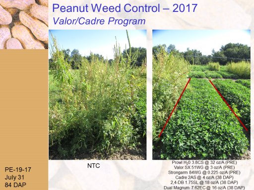 Peanut Weed Control – 2017 Valor/Cadre Program<BR>PE-19-17 <BR>July 31 <BR>84 DAP<BR>NTC<BR>Prowl H20 3.8CS @ 32 oz/A (PRE) <BR>Valor SX 51WG @ 3 oz/A (PRE) <BR>Strongarm 84WG @ 0.225 oz/A (PRE) <BR>Cadre 2AS @ 4 oz/A (38 DAP) <BR>2,4-DB 1.75SL @ 18 oz/A (38 DAP) <BR>Dual Magnum 7.62EC @ 16 oz/A (38 DAP)<BR>