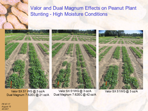 Valor and Dual Magnum Effects on Peanut Plant Stunting - High Moisture Conditions <BR>PE-67-17 <BR>August 15 <BR>48 DAT<BR>Valor SX 51 WG @ 3 oz/A <BR>Dual Magnum 7.62EC @ 21 oz/A<BR>Valor SX 51WG @ 3 oz/A <BR>Dual Magnum 7.62EC @ 42 oz/A<BR>Valor SX 51WG @ 3 oz/A<BR>