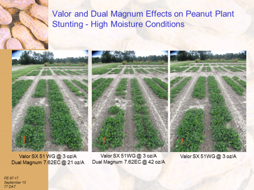 Valor and Dual Magnum Effects on Peanut Plant Stunting - High Moisture Conditions <BR>PE-67-17 <BR>September 13 <BR>77 DAT<BR>Valor SX 51 WG @ 3 oz/A <BR>Dual Magnum 7.62EC @ 21 oz/A<BR>Valor SX 51WG @ 3 oz/A <BR>Dual Magnum 7.62EC @ 42 oz/A<BR>Valor SX 51WG @ 3 oz/A<BR>