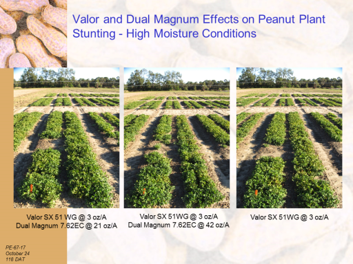 Valor and Dual Magnum Effects on Peanut Plant Stunting - High Moisture Conditions <BR>PE-67-17 <BR>October 24 <BR>118 DAT<BR>Valor SX 51 WG @ 3 oz/A <BR>Dual Magnum 7.62EC @ 21 oz/A<BR>Valor SX 51WG @ 3 oz/A <BR>Dual Magnum 7.62EC @ 42 oz/A<BR>Valor SX 51WG @ 3 oz/A<BR>