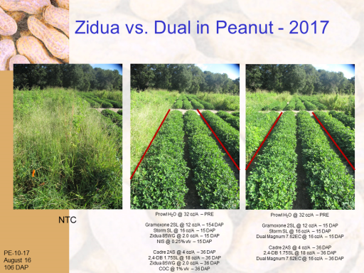 Zidua vs. Dual in Peanut - 2017<BR>PE-10-17 <BR>August 16 <BR>106 DAP<BR>NTC<BR>Prowl H2O @ 32 oz/A – PRE <BR> <BR>Gramoxone 2SL @ 12 oz/A – 154 DAP <BR>Storm SL @ 16 oz/A – 15 DAP <BR>Zidua 85WG @ 2.0 oz/A – 15 DAP <BR>NIS @ 0.25% v/v – 15 DAP <BR> <BR>Cadre 2AS @ 4 oz/A – 36 DAP <BR>2,4-DB 1.75SL @ 18 oz/A – 36 DAP <BR>Zidua 85WG @ 2.0 oz/A – 36 DAP <BR>COC @ 1% v/v – 36 DAP<BR>Prowl H2O @ 32 oz/A – PRE <BR> <BR>Gramoxone 2SL @ 12 oz/A – 15 DAP <BR>Storm SL @ 16 oz/A – 15 DAP <BR>Dual Magnum 7.62EC @ 16 oz/A – 15 DAP <BR> <BR>Cadre 2AS @ 4 oz/A – 36 DAP <BR>2,4-DB 1.75SL @ 18 oz/A – 36 DAP <BR>Dual Magnum 7.62EC @ 16 oz/A – 36 DAP<BR>