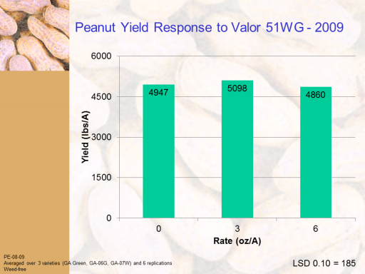 Peanut Yield Response to Valor 51WG - 2009<BR>PE-08-09 <BR>Averaged over 3 varieties (GA Green, GA-06G, GA-07W) and 6 replications <BR>Weed-free<BR>LSD 0.10 = 185<BR>