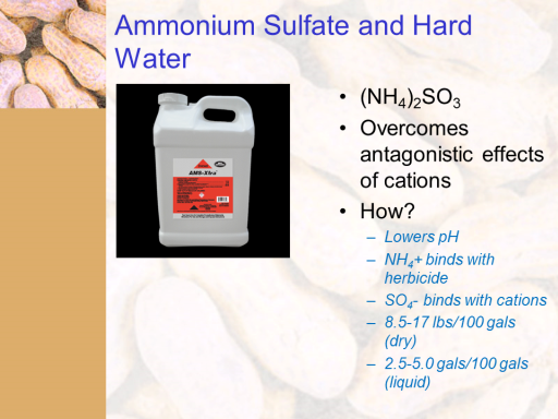 Ammonium Sulfate and Hard Water<BR>(NH4)2SO3 <BR>Overcomes antagonistic effects of cations <BR>How? <BR>Lowers pH <BR>NH4+ binds with herbicide <BR>SO4-  binds with cations <BR>8.5-17 lbs/100 gals (dry) <BR>2.5-5.0 gals/100 gals (liquid) <BR>