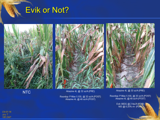 Evik or Not?<BR>CN-01-16 <BR>July 7 <BR>108 DAP<BR>NTC<BR>Atrazine 4L @ 32 oz/A (PRE) <BR> <BR>Roundup P-Max 5.5SL @ 32 oz/A (POST) <BR>Atrazine 4L @ 48 oz/A (POST)<BR>Atrazine 4L @ 32 oz/A (PRE) <BR> <BR>Roundup P-Max 5.5SL @ 32 oz/A (POST) <BR>Atrazine 4L @ 48 oz/A (POST) <BR> <BR>Evik 80DG @ 2 lbs/A (PDIR) <BR>NIS @ 0.25% v/v (PDIR)<BR>