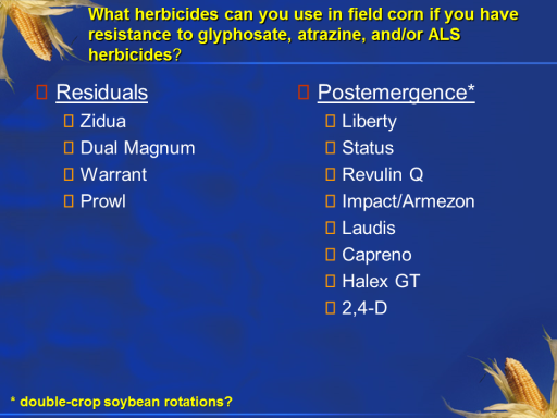 What herbicides can you use in field corn if you have resistance to glyphosate, atrazine, and/or ALS herbicides?<BR>Residuals <BR>Zidua <BR>Dual Magnum <BR>Warrant <BR>Prowl<BR>Postemergence* <BR>Liberty <BR>Status <BR>Revulin Q <BR>Impact/Armezon <BR>Laudis <BR>Capreno <BR>Halex GT <BR>2,4-D<BR>* double-crop soybean rotations?<BR>