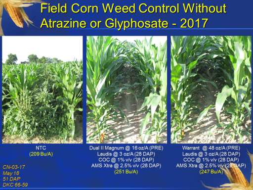 Field Corn Weed Control Without Atrazine or Glyphosate - 2017<BR>NTC <BR>(209 Bu/A)<BR>CN-03-17 <BR>May 18 <BR>51 DAP <BR>DKC 66-59<BR>Dual II Magnum @ 16 oz/A (PRE) <BR>Laudis @ 3 oz/A (28 DAP) <BR>COC @ 1% v/v (28 DAP) <BR>AMS Xtra @ 2.5% v/v (28 DAP) <BR>(251 Bu/A)<BR>Warrant  @ 48 oz/A (PRE) <BR>Laudis @ 3 oz/A (28 DAP) <BR>COC @ 1% v/v (28 DAP) <BR>AMS Xtra @ 2.5% v/v (28 DAP) <BR>(247 Bu/A)<BR>